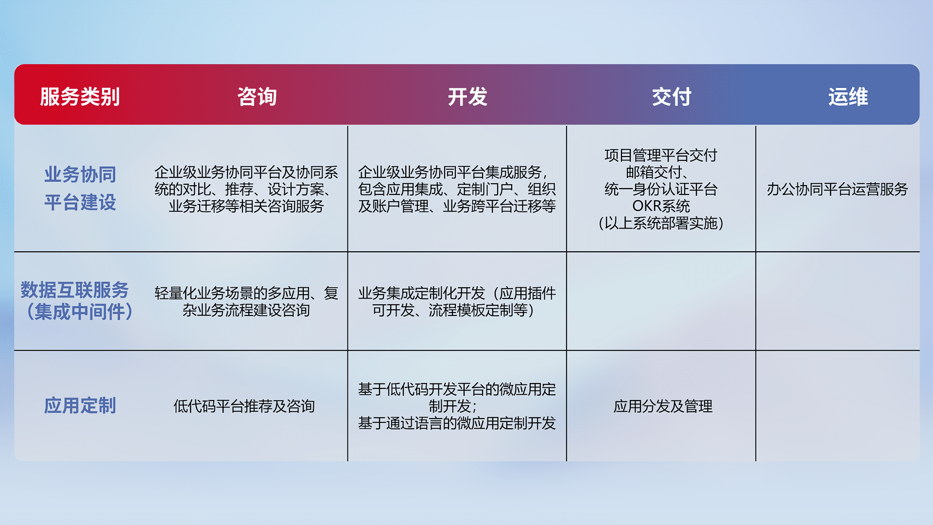 针对钉钉、、、、企微、、、、IDaas等平台级产品提供产品的规划、、方案、、交付、、定制化开发等服务,,,,实现如统一协同办公、、、、智能客户服务、、、混合会议管理、、智能数据查询、、、等业务场景,,,实现数字化转型。。。。